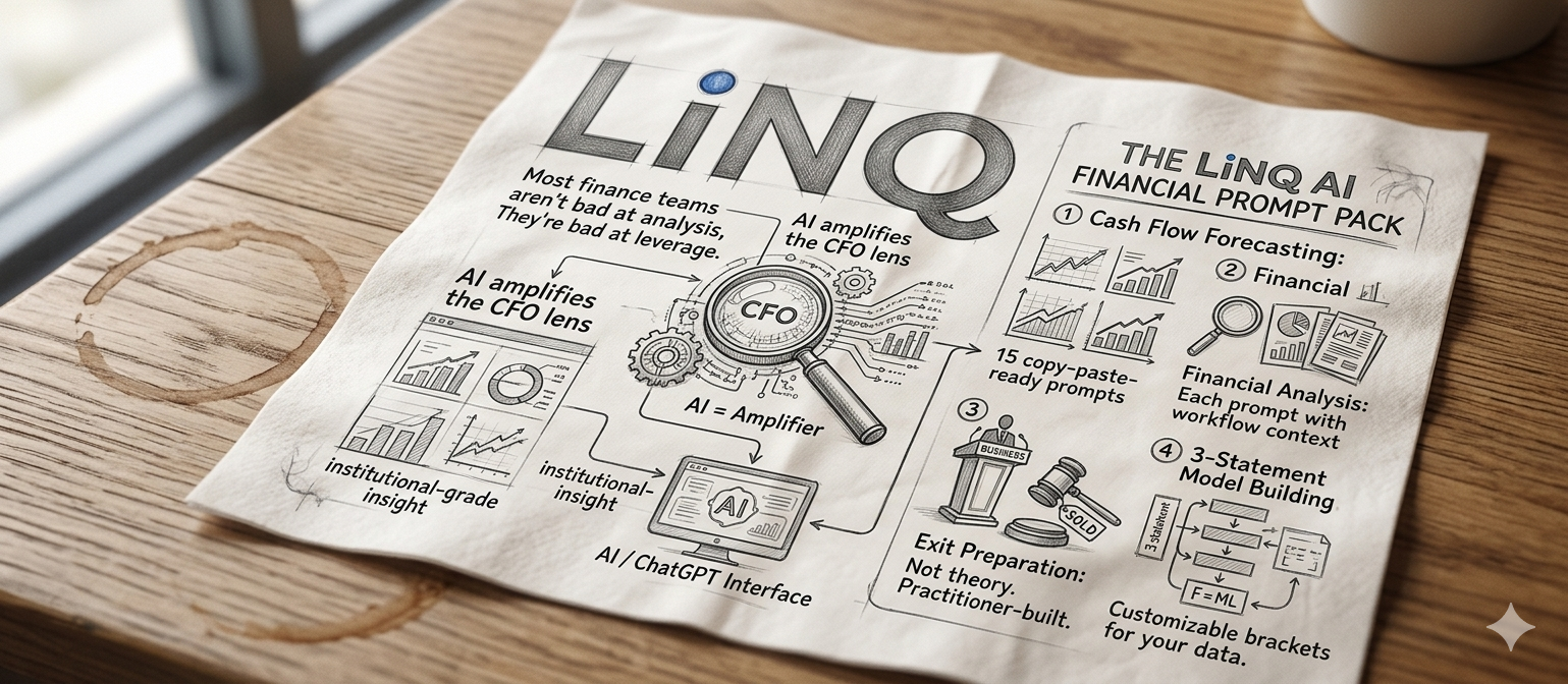 The LiNQ AI Financial Prompt Pack gives you 15 copy-paste-ready prompts across four categories: cash flow forecasting, financial analysis, exit preparation, and 3-statement modeling. Each prompt includes a usage note and real workflow context.